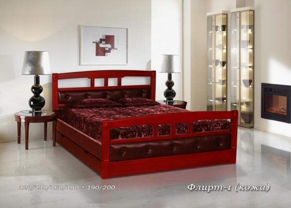 Кровать из натурального дерева, с кожей, двумя бельевыми ящиками и высокой спинкой изножья.